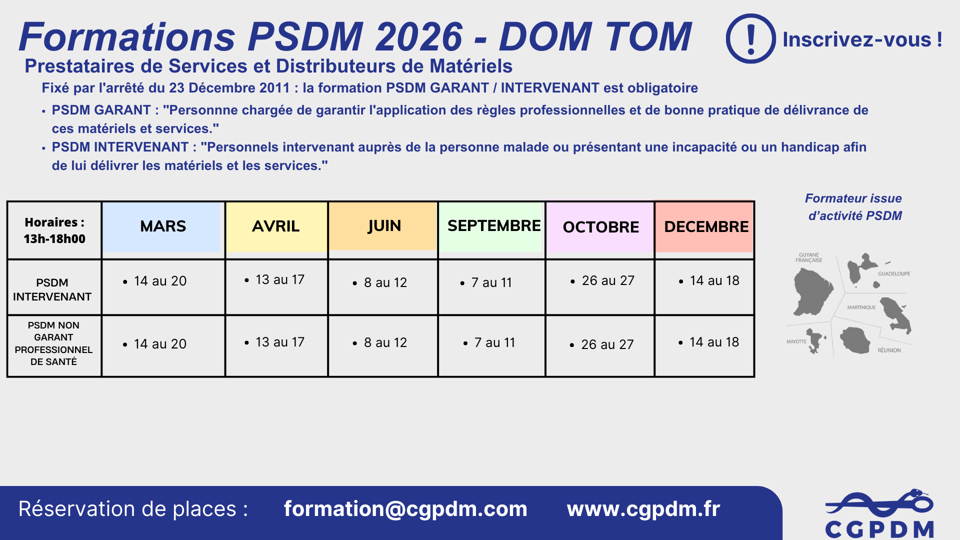 - Dates de formation spécifique au Guadeloupe, Martinique, Guyane, La Réunion, Mayotte, Nouvelle-Calédonie, Polynésie Française.